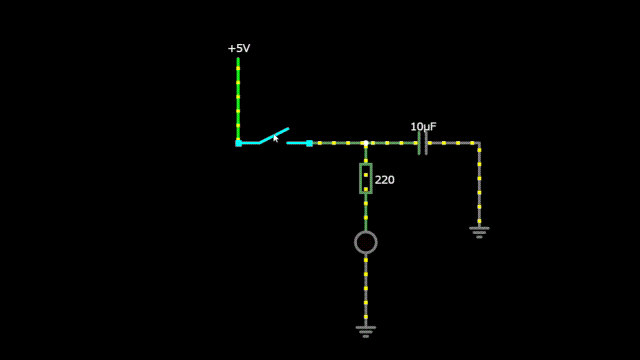 スイッチをオンにしてコンデンサに電圧をかけると、ほぼ瞬時コンデンサの電圧が5Vになる。スイッチを切ると、コンデンサの中の電荷が放出されLEDに電流が流れる。このとき、LEDの前の抵抗の値によって放電するのに時間がかかるため、LEDはゆっくり暗くなっていく。
