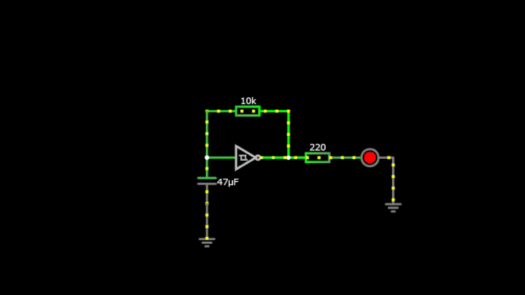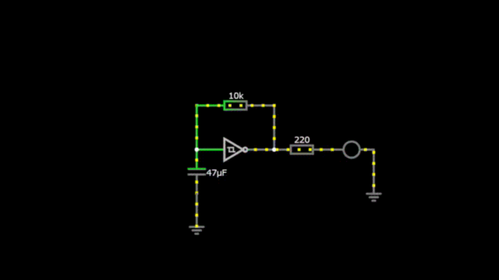 このような性質をもつコンデンサとシュミットトリガインバータを接続すると、点滅させる回路=発振回路を作ることができる。